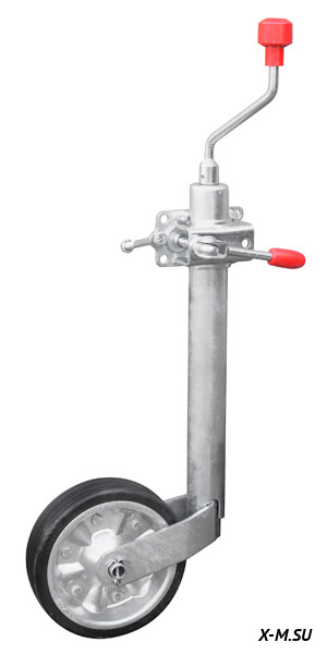 Оцинкованное опорное колесо (Ø48) с упорным подшипником рукоятки, в комплекте с элементами крепежа, для установки на прицепы МЗСА с полной массой до 750 кг (ширина трубы дышла 50 мм). Регулируется по высоте, обеспечивает горизонтальное положение прицепа и облегчает его перемещение без тягача.